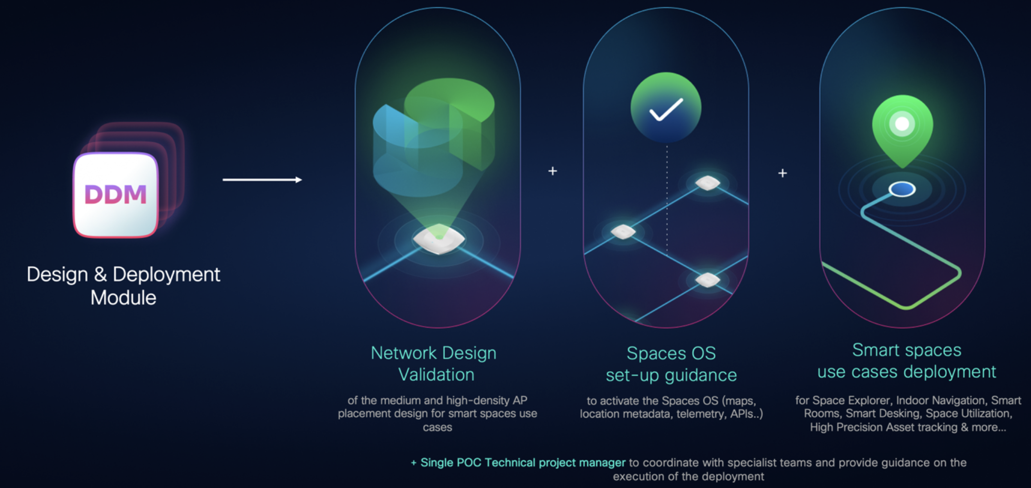The DDM is meant to augment and work with existing partner engagements. Cisco Spaces DDM will work with you through validation, Smart Spaces OS activation, and Use Cases deployment to ensure your network, and your buildings are optimized and ready to support smart spaces outcomes such as precise location and asset tracking, indoor navigation, occupancy analytics and more.