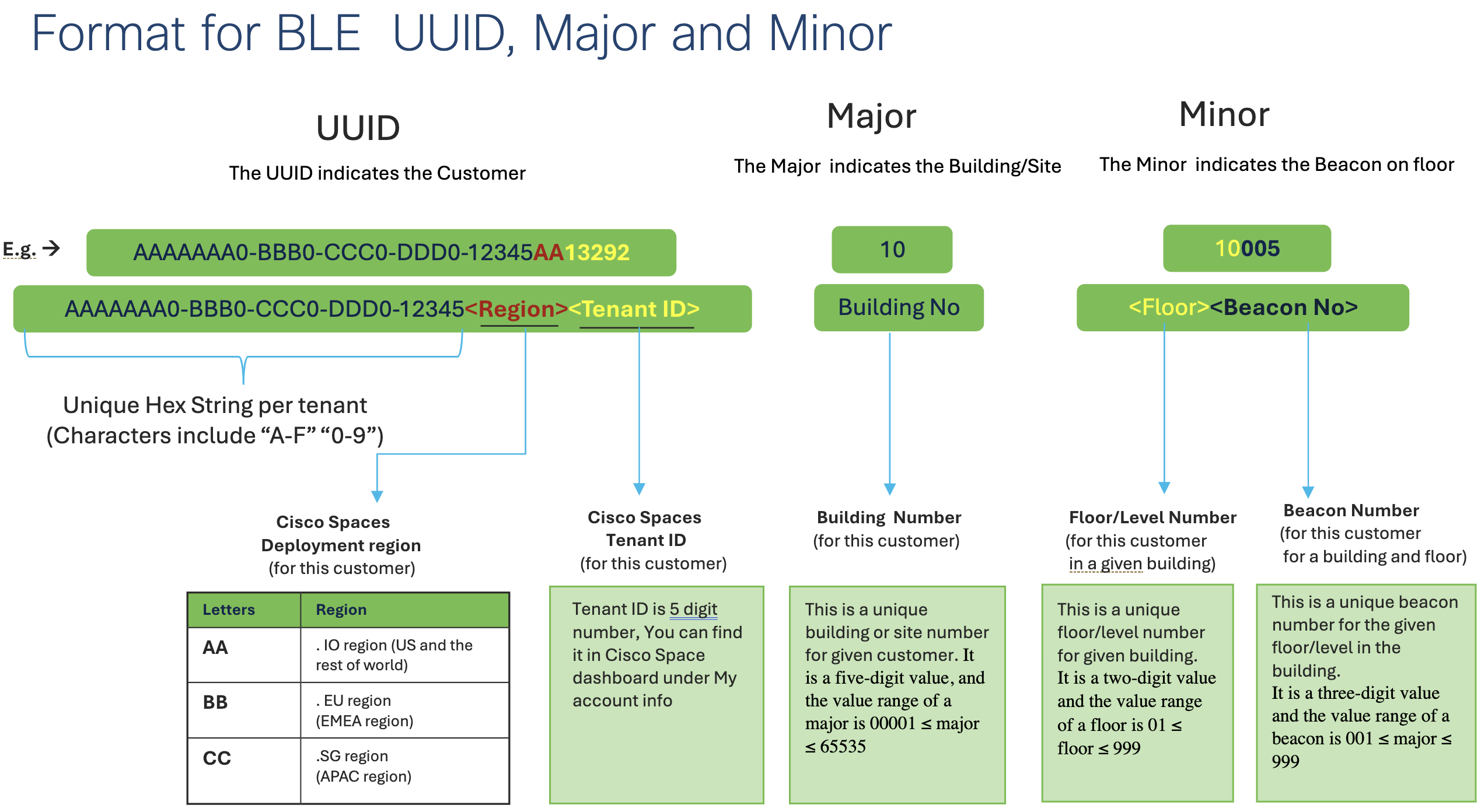 A naming convention for the BLE beacons is to be used. The format for the UUID, major, and minor values that leverage the Spaces tenant ID, a building enumeration, the floor number, and a beacon enumeration. See below for the schema.