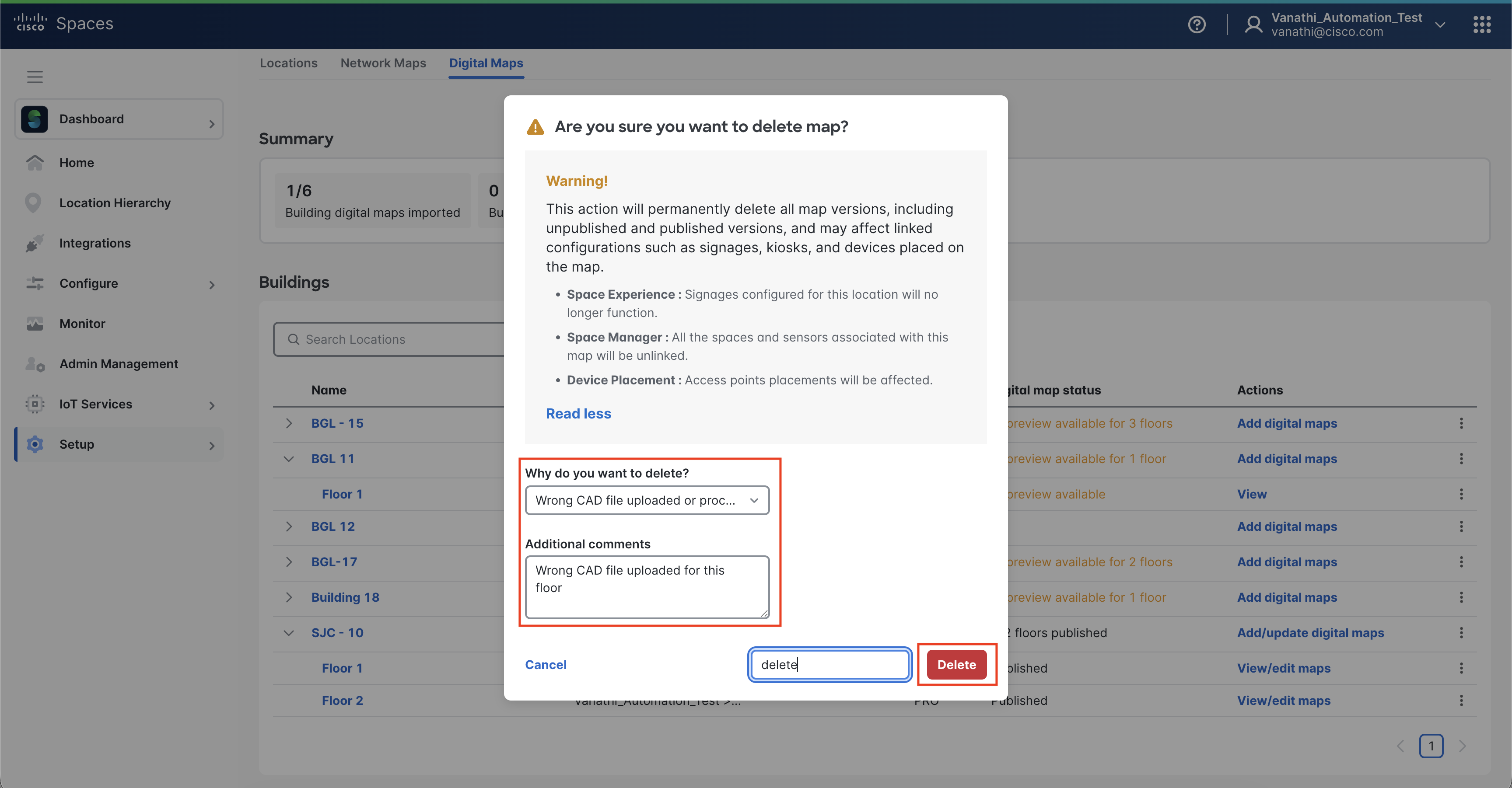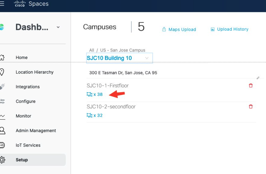 Currently, it is not possible to delete individual floor Digital Maps. Please open a TAC case to request help removing unwanted files until this feature is available in the dashboard.