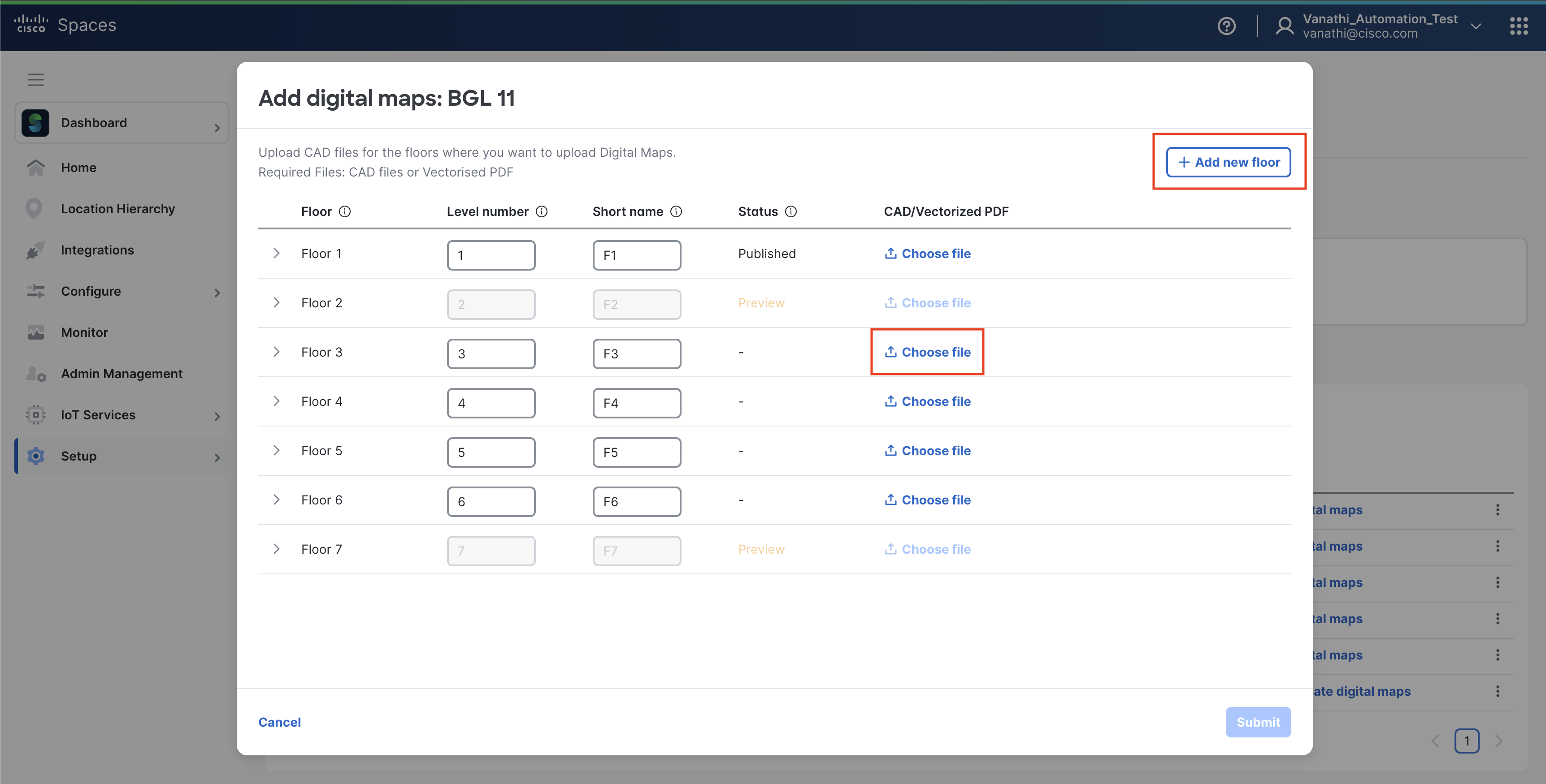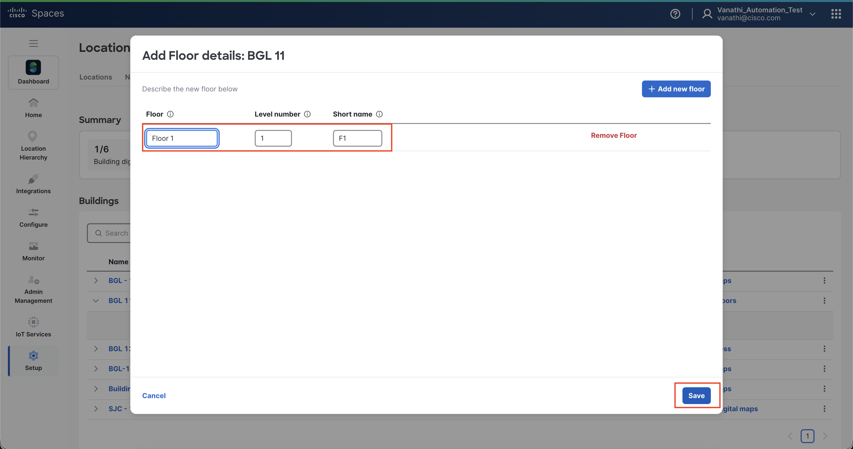 Add floors by clicking "Add new floor" and providing necessary metadata like level numbers and short names.