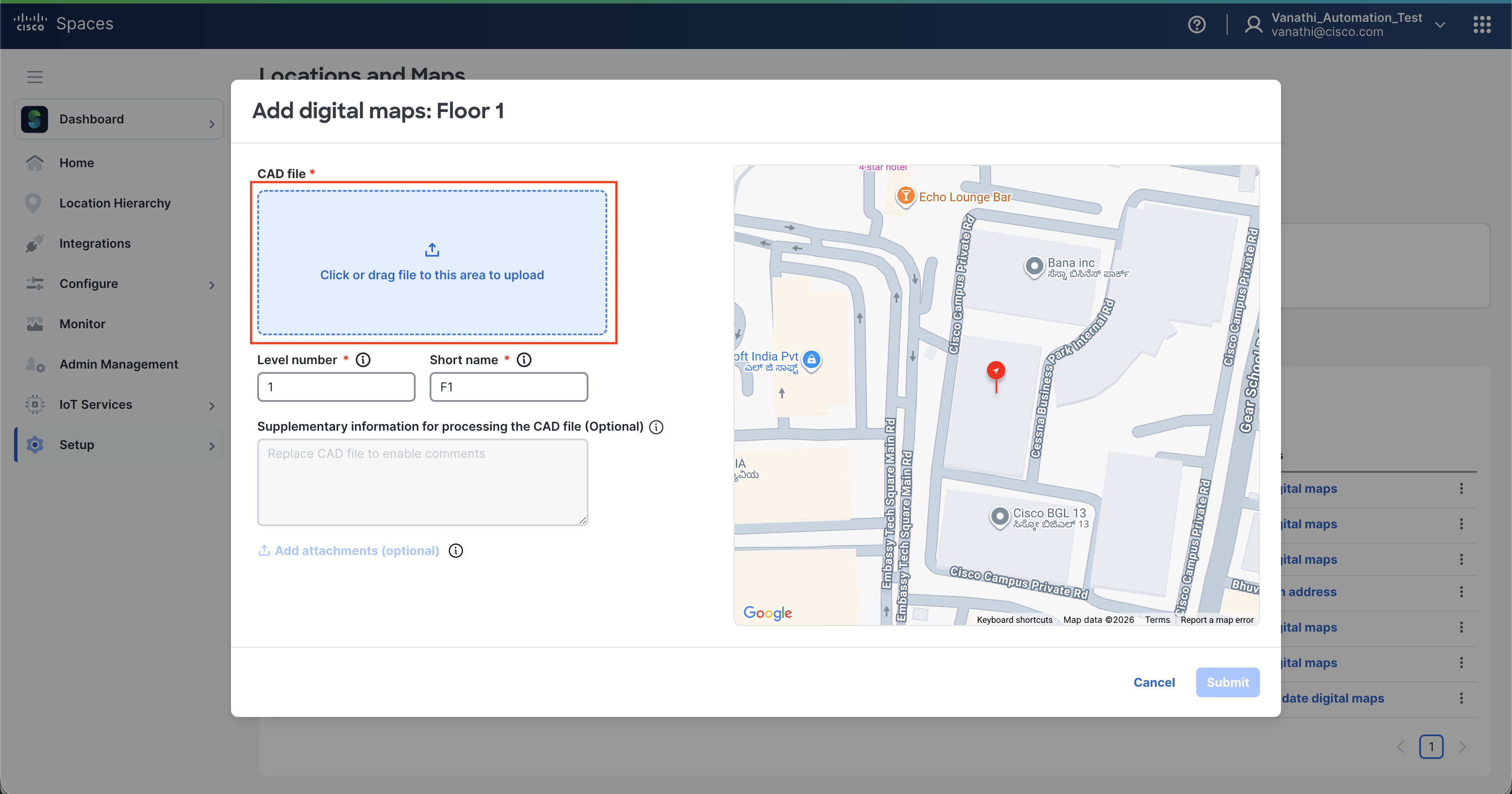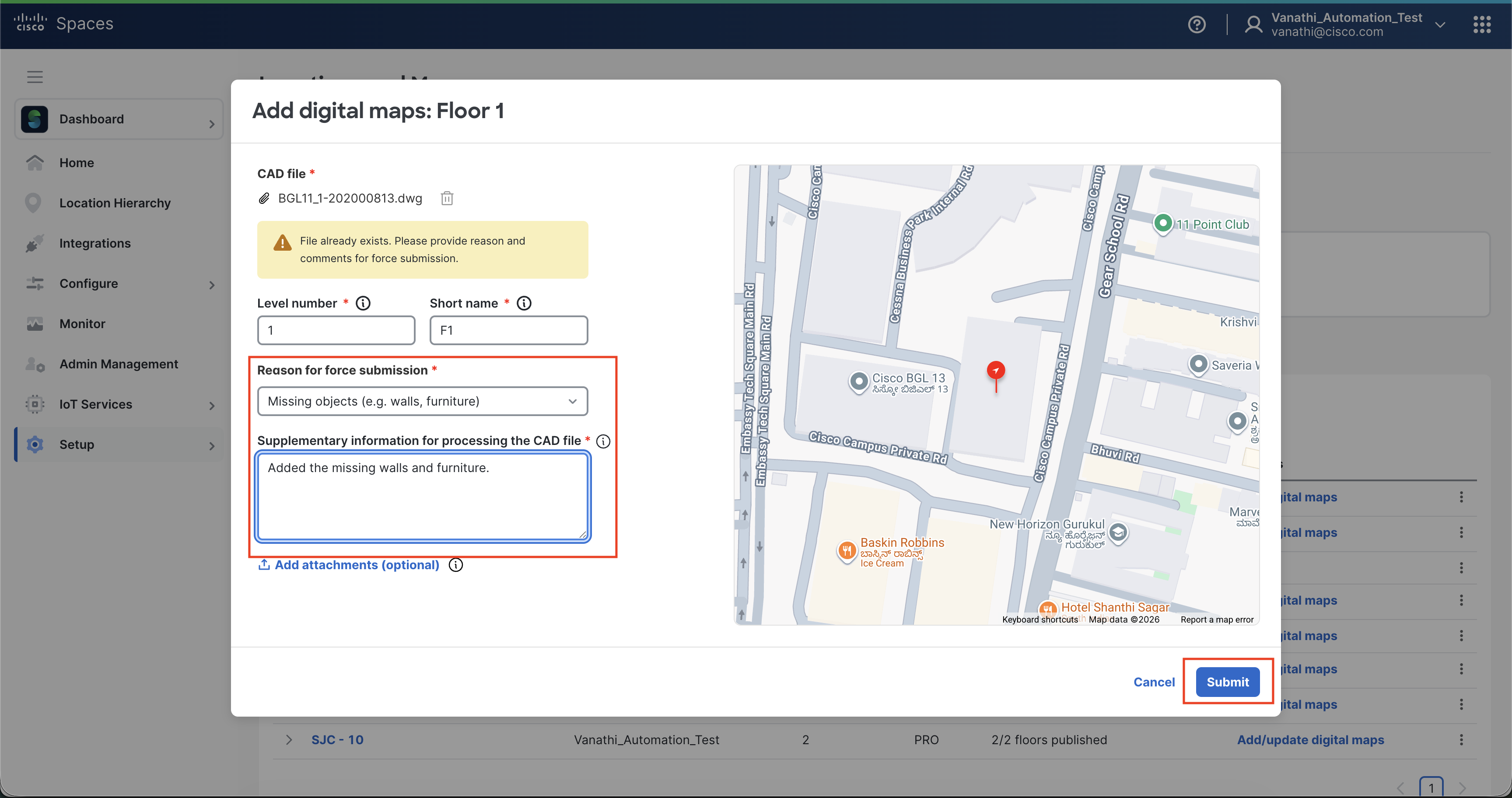 Similar to scenario 2 above, the Location Hierarchy has changed and the exact same files are used to create the same Digital Map Pro in a new Location. Use the appropriate reason dropdown option: “Changed street address or GPS center-point of building”. This also applies to re-uploading when the Cisco Spaces mapping team has declined/rejected a CAD file because the building could not be found on the world map. Please provide additional details in the comments field to help the mapping team accurately align the Digital Map Pro on the world map for accuracy in outcomes.