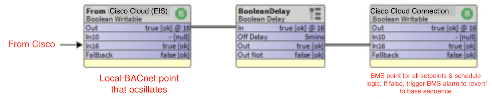 Cisco cloud will change the value of this point every 60 seconds, It will toggle from ON to OFF. The BMS will need to be programmed to monitor this point and if it does not see a change of value over a 5 minute (adjustable) period, the Cisco gateway connection status will be off and remain off until communications are reestablished.