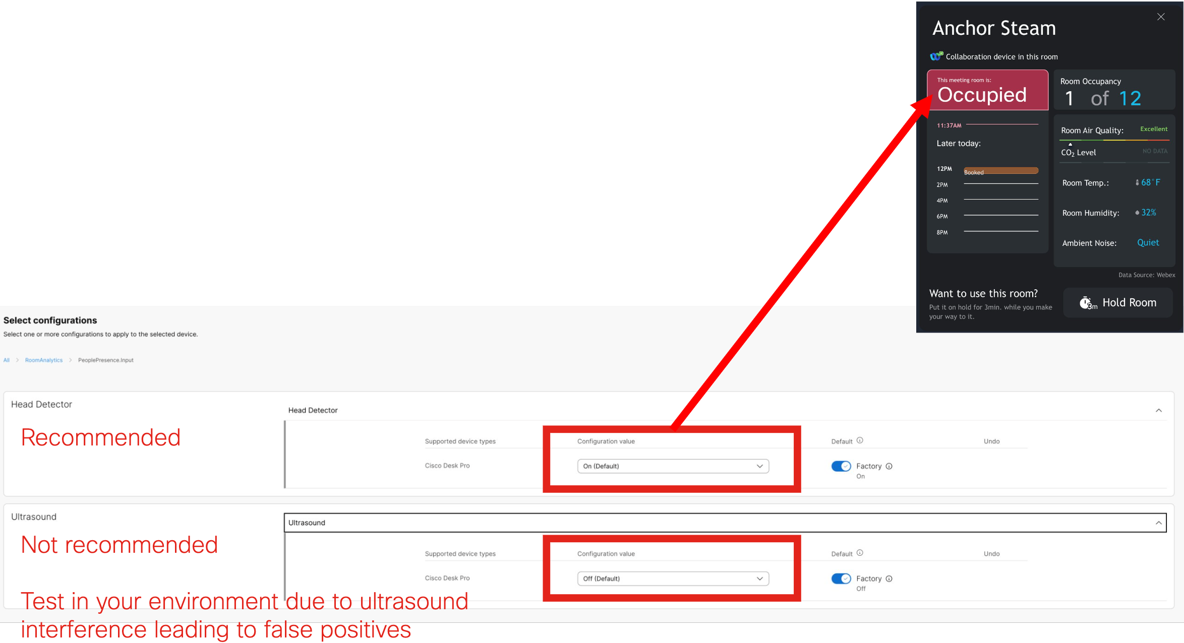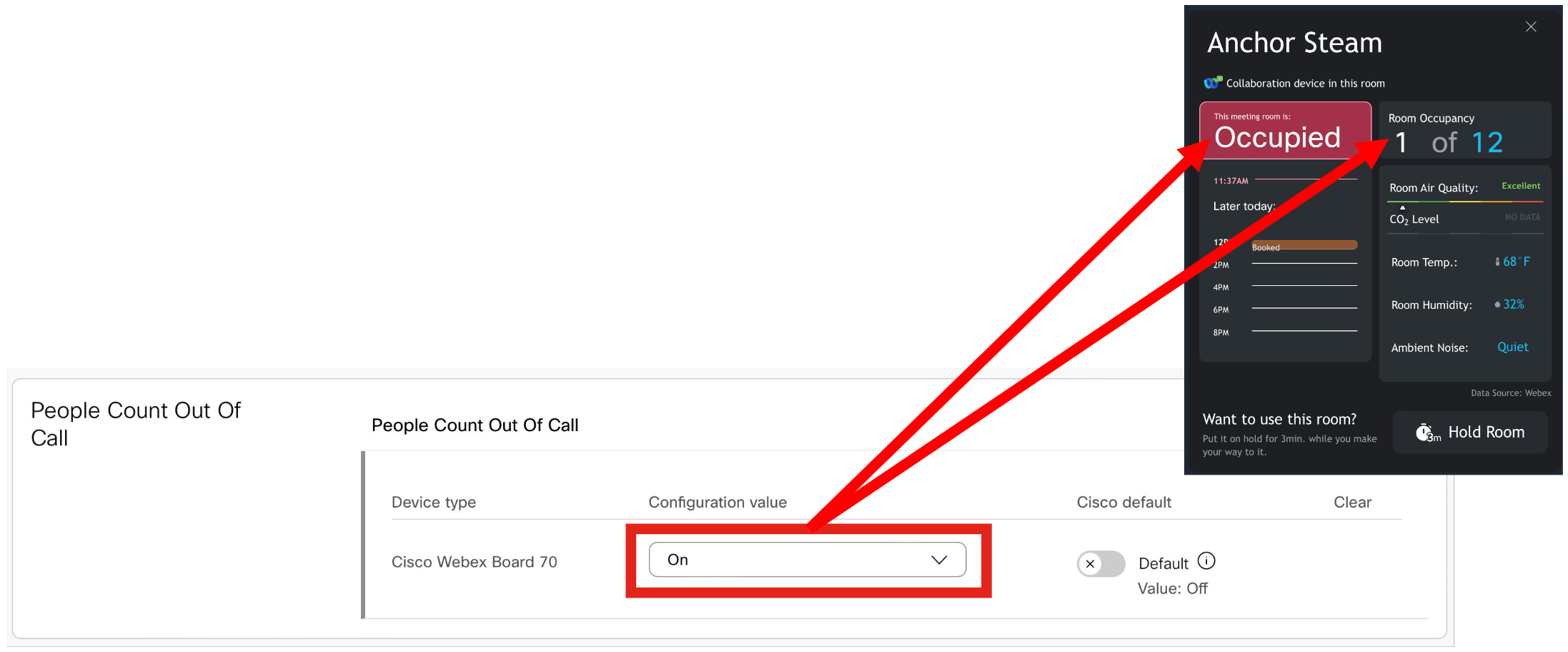 We use your existing Webex collaboration devices, such as the Webex Room bar, as an occupancy sensor by utilizing the person detecting ability native to the Webex cameras.