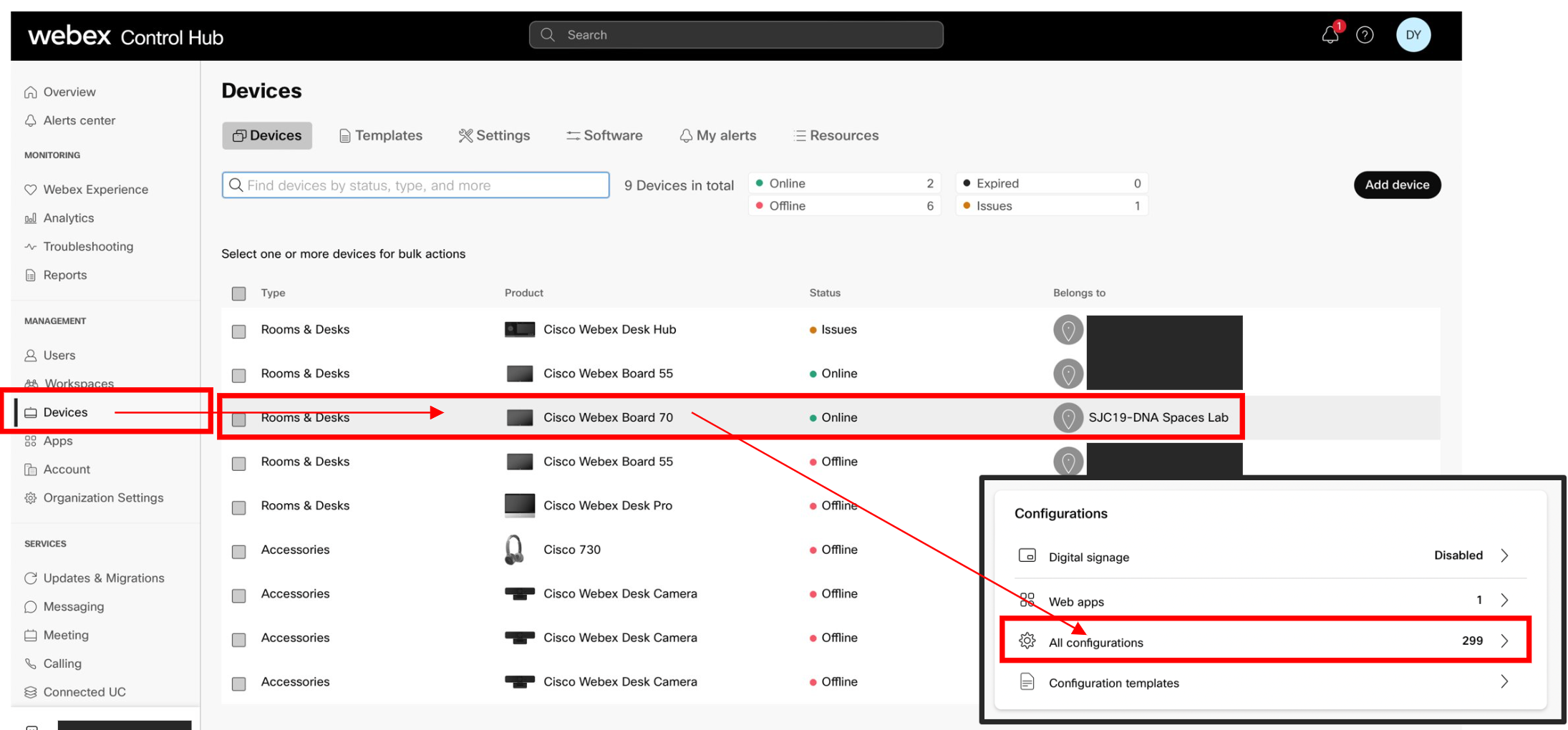 Log into Webex Control Hub, and navigate to the Devices tab.
