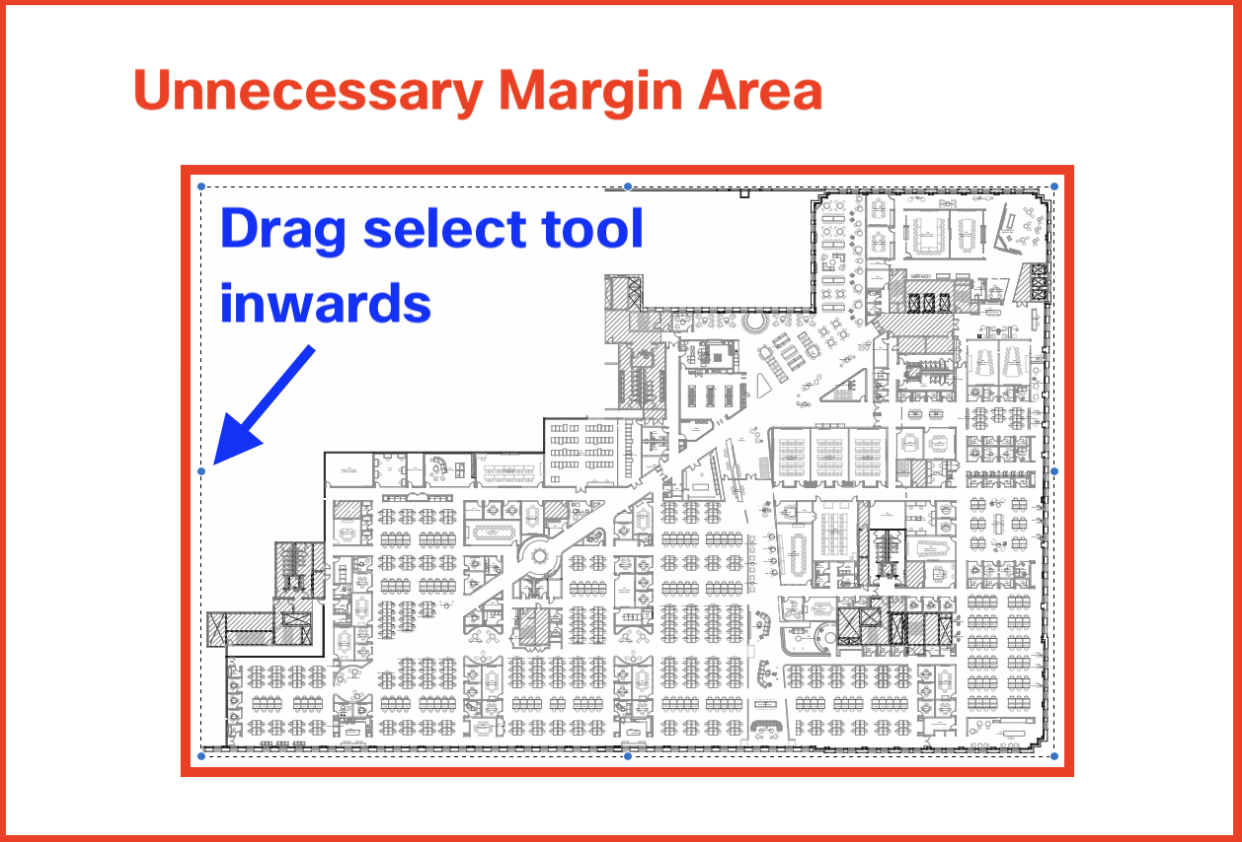 Figure 1 – The unnecessary margin area in the example image file (.png) is denoted by the two red boxes. The area between the red lines is unnecessary and can result in inaccuracies in indoor location data.