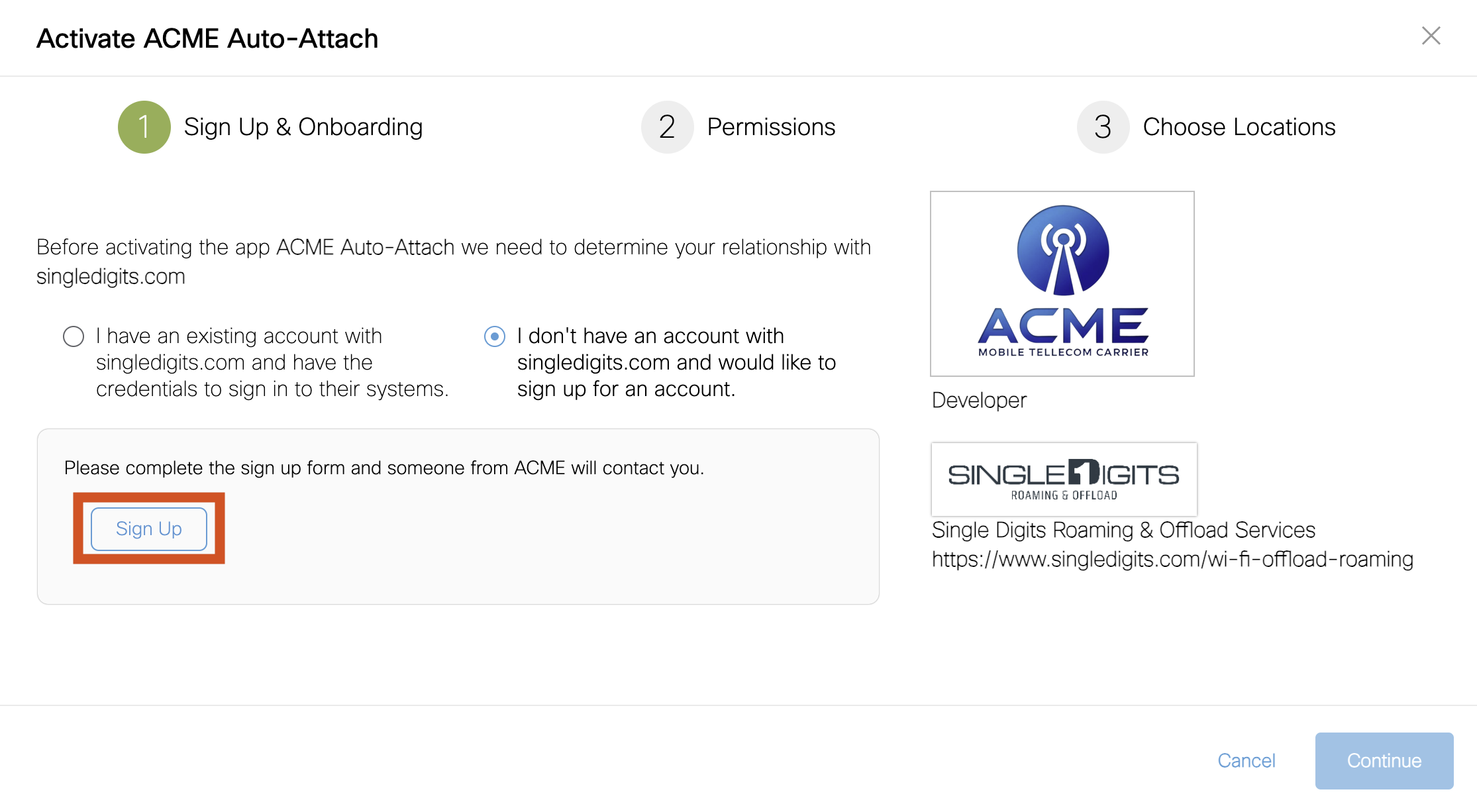The steps below demonstrate how to setup and activate ACME Auto-Attach application that will allow businesses to deploy carrier offload.