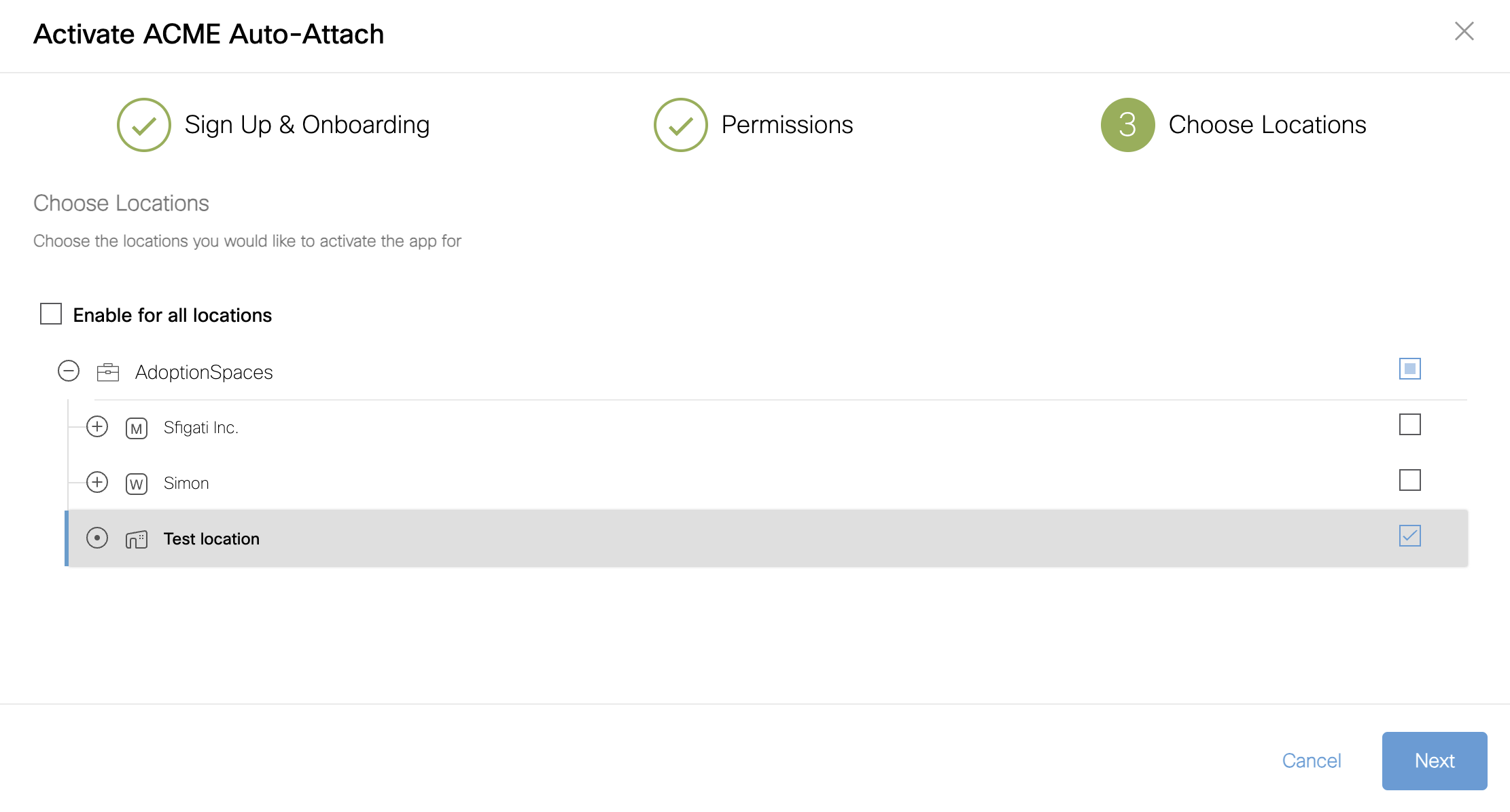Next, we need to choose locations for which we want to enable ACME Auto-Attach carrier offload. You can either check the box Enable for all locations or select specific locations from your location hierarchy and Click Next.