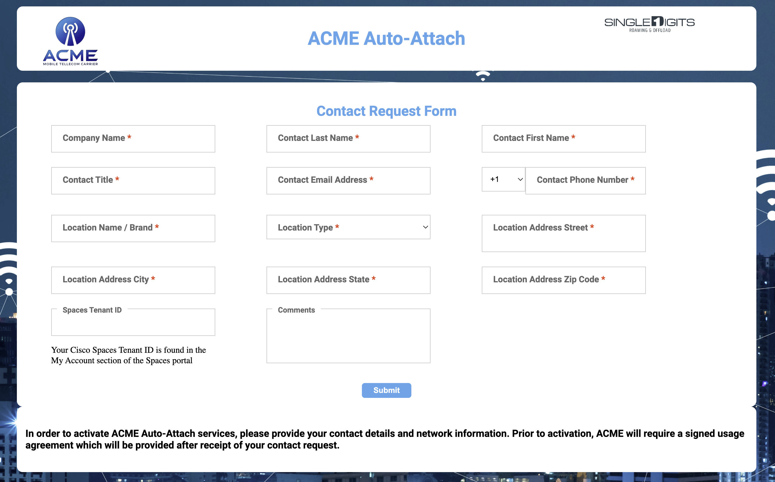 Once the form is filled, ACME will contact you via email and setup a meeting to discuss location, location information and to sign their agreement. Essentially, ACME wants to ensure that their customers will have a good experience when being offloaded to your wireless network.