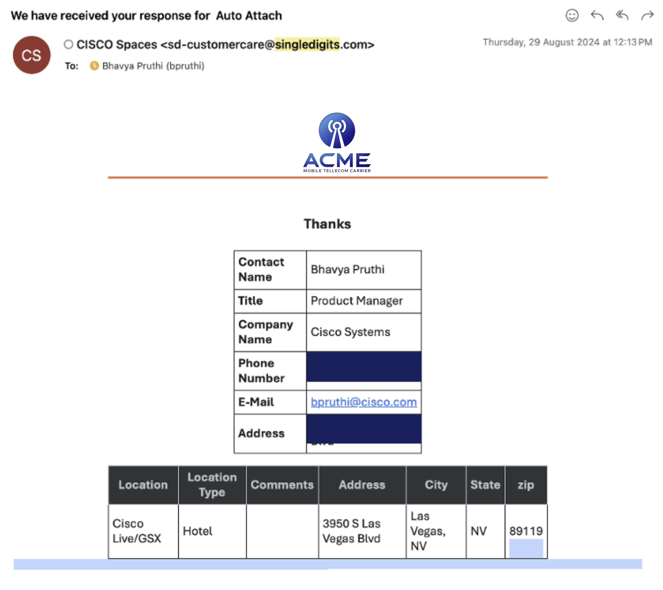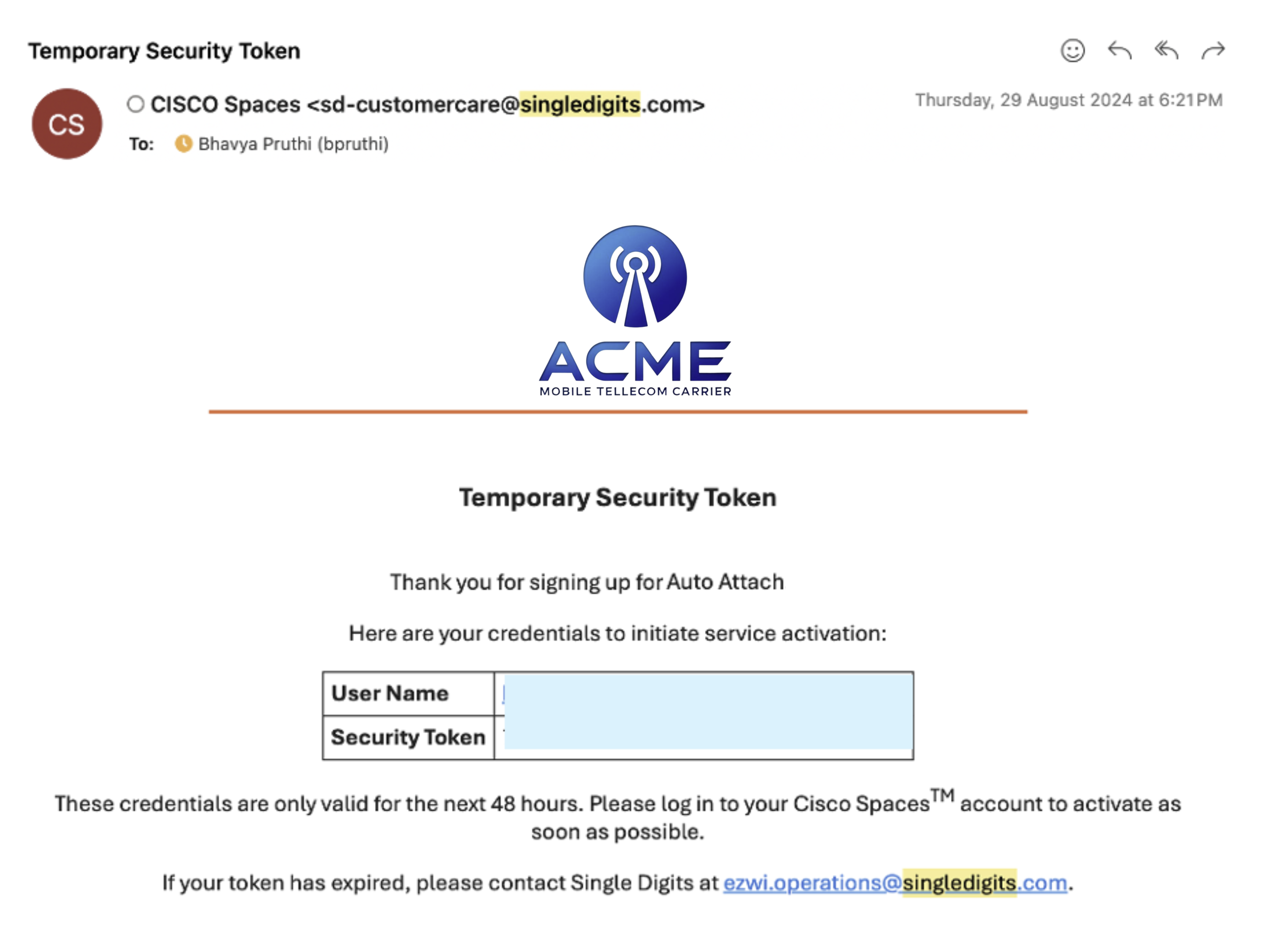 An email is sent from ACME to confirm that the ACME Auto-Attach application is live and you are offloading carrier traffic to your network.