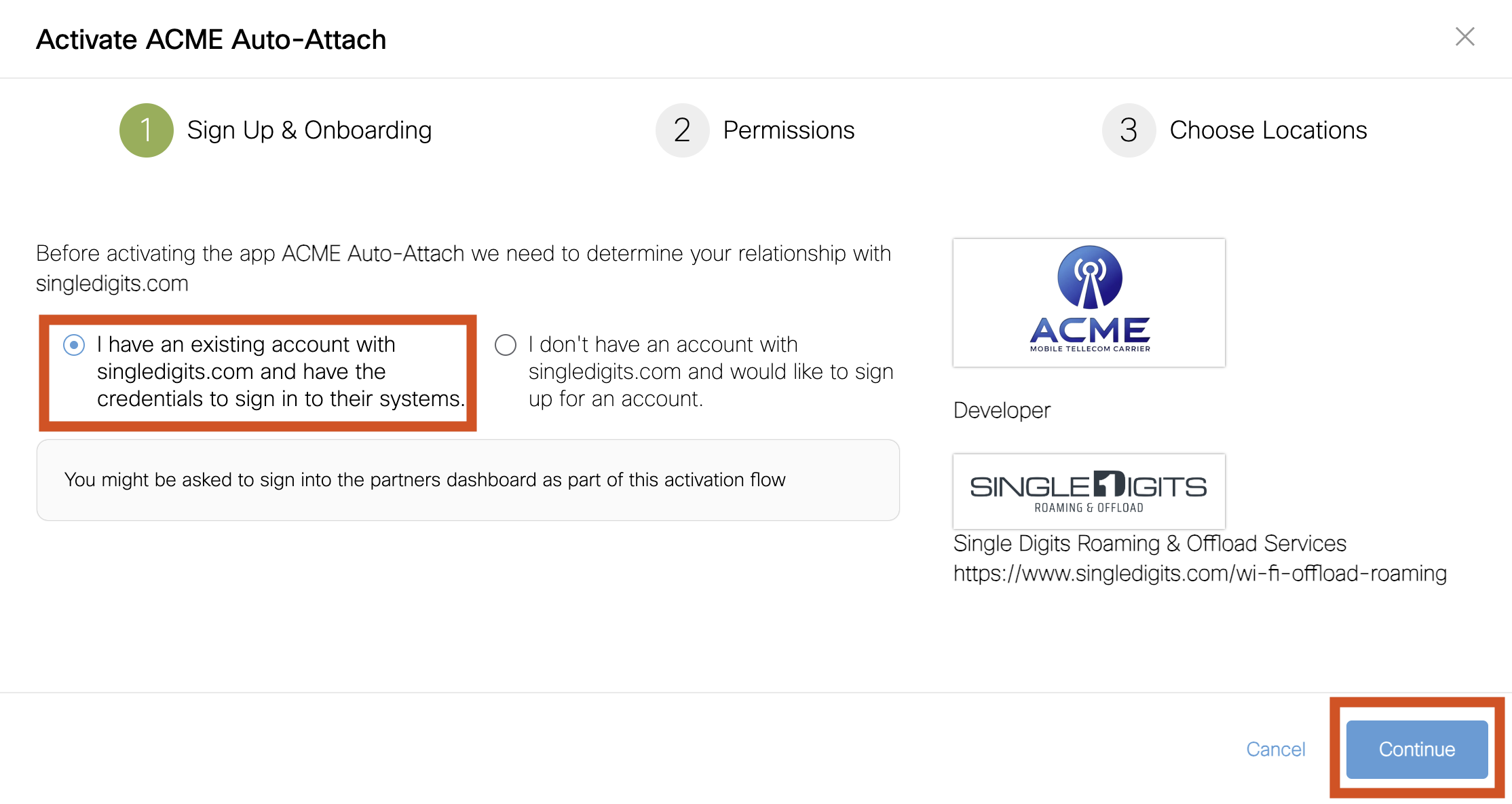 A pop-up window is displayed, choose option 1 stating you have an existing account and Click Continue