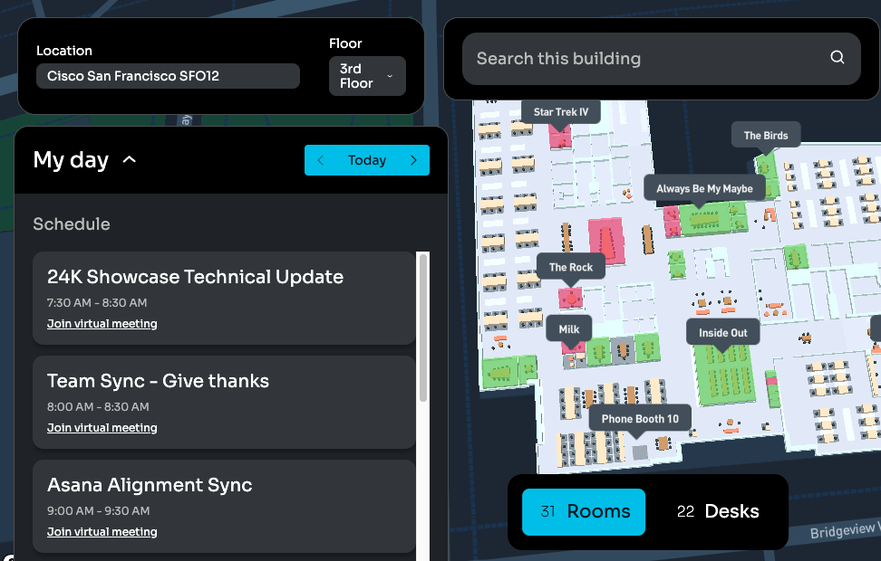 Cisco Spaces Web App (ciscospaces.app map-only experience) | ![]() | n/a | Quick and easy to setup and start desk booking. Option to expand and build on the core desk booking experience later. Supports desk booking up to 14 days in advance. | It can be confusing to end users which desks are booked and ciscospaces.app may not be discoverable. Effort required to build awareness around desk booking culture/policy. Does not sync with Outlook/Gcal calendar and does not work with Webex App user check-in. |
