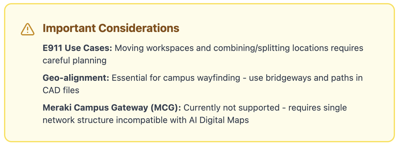 A current pre-requisite for the Meraki Cloud Gateway (MCG) appliance is that all networks and floorplans must be combined into a single Network in Meraki Dashboard. This will result in a single Location (i.e. Building) in Cisco Spaces Dashboard with floors from across the entire campus. This Location Hierarchy structure is incompatible with the AI Digital Maps component of the Spaces OS because CAD floorplans of buildings need to be separated by physical buildings and cannot exist in a single combined Location. Similarly, Control Hub and Catalyst Center Locations and Floors will not be able to merge into the MCG Network structure.