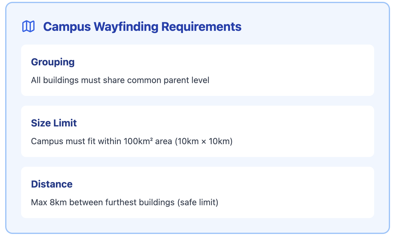 A group of Buildings (i.e. Campus) MUST fit within a 100km² area (roughly 10km x 10km). To be safe, the distance between the 2 furthest buildings must be no more than 8km.