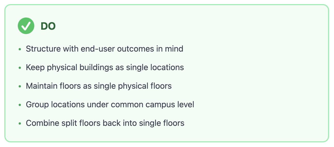 A well-structured Location Hierarchy is the blueprint for all Cisco Spaces outcomes. It is important to structure the hierarchy with end user outcomes in mind as employees, guests, etc. may need to consume services in more intuitive ways than how systems are setup for IT or facilities outcomes. For example, a guest to an office space may not understand the layout of the building, so the Indoor Navigation feature on their phone may improve their ability to find different parts of the building. If the maps and directions are not intuitive, users may become confused and get lost more easily. Single physical buildings are then recommended over splitting into multiple buildings. Keeping floors as single floors per physical space instead of separating into “wings” or towers is strongly encouraged.