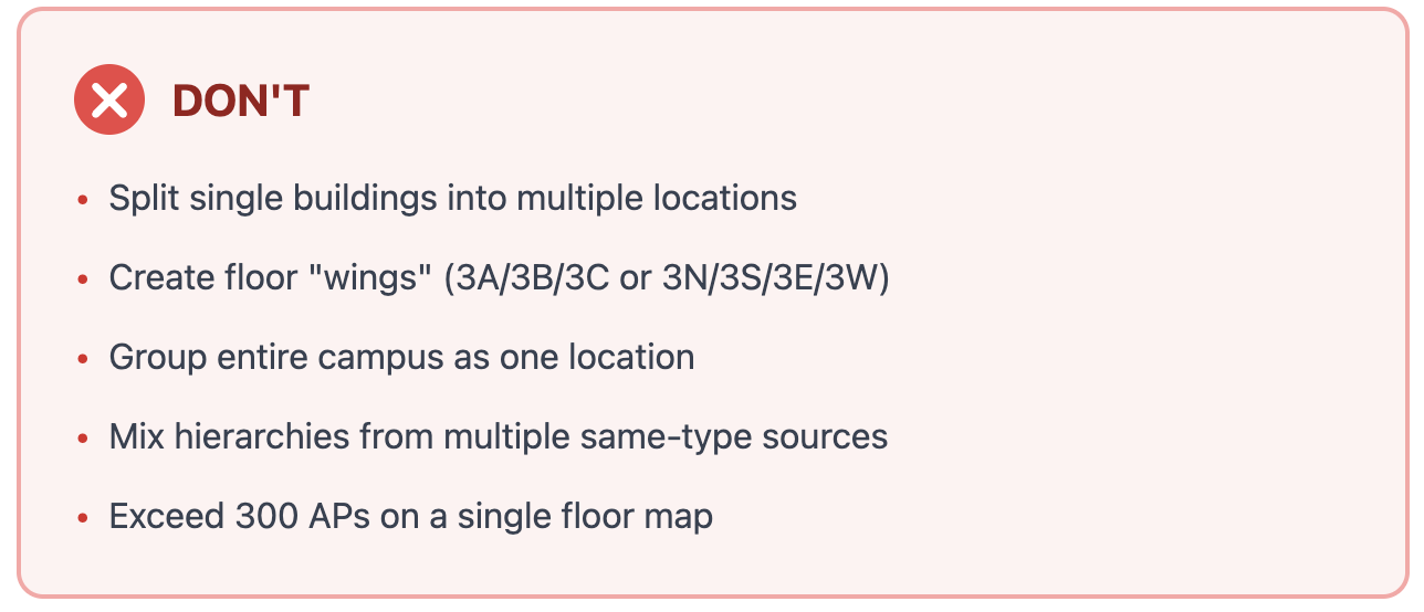 There can always be technical and physical limitations that may need clever solutions or feature enhancements, so it is not expected to force a particular Location Hierarchy. However, a best effort should be made to follow best practice and guidance in this Cisco Spaces Knowledge Article.
