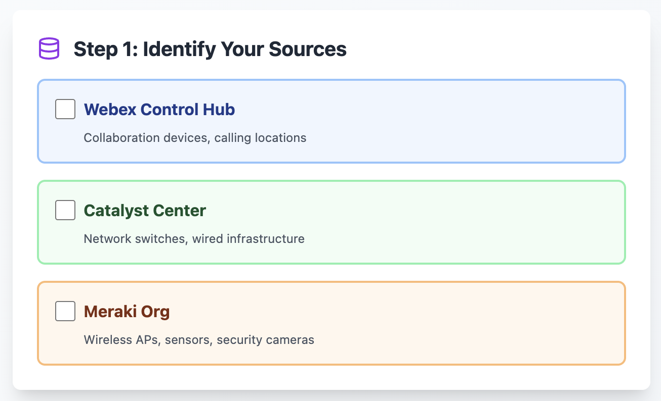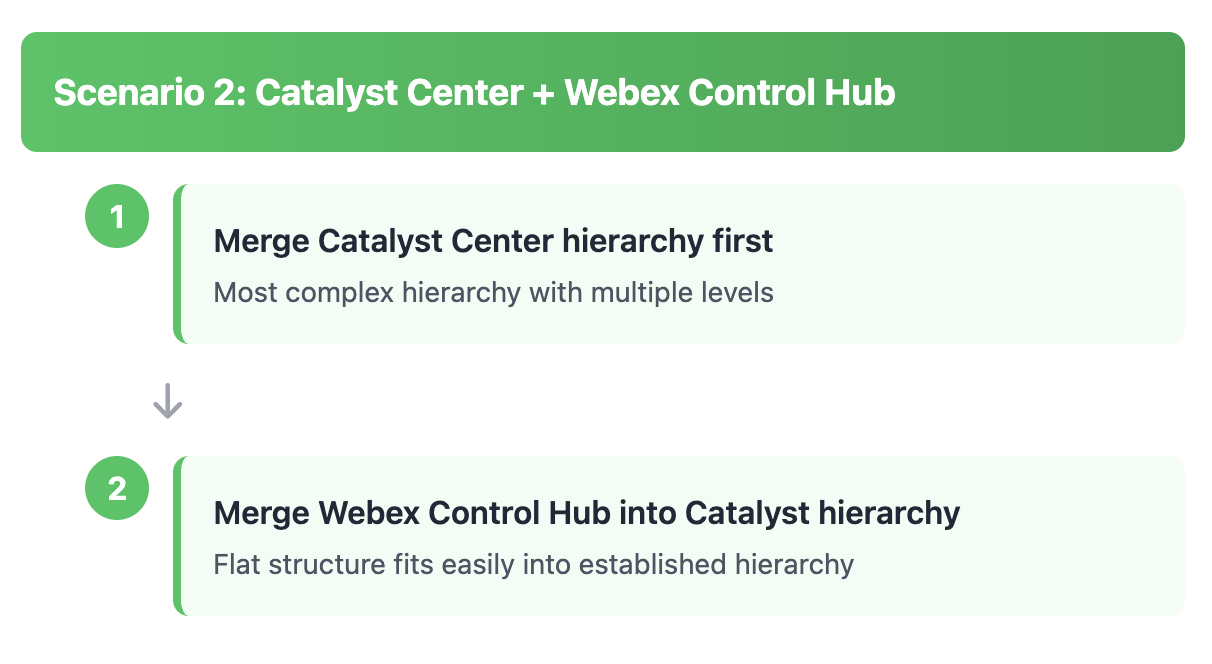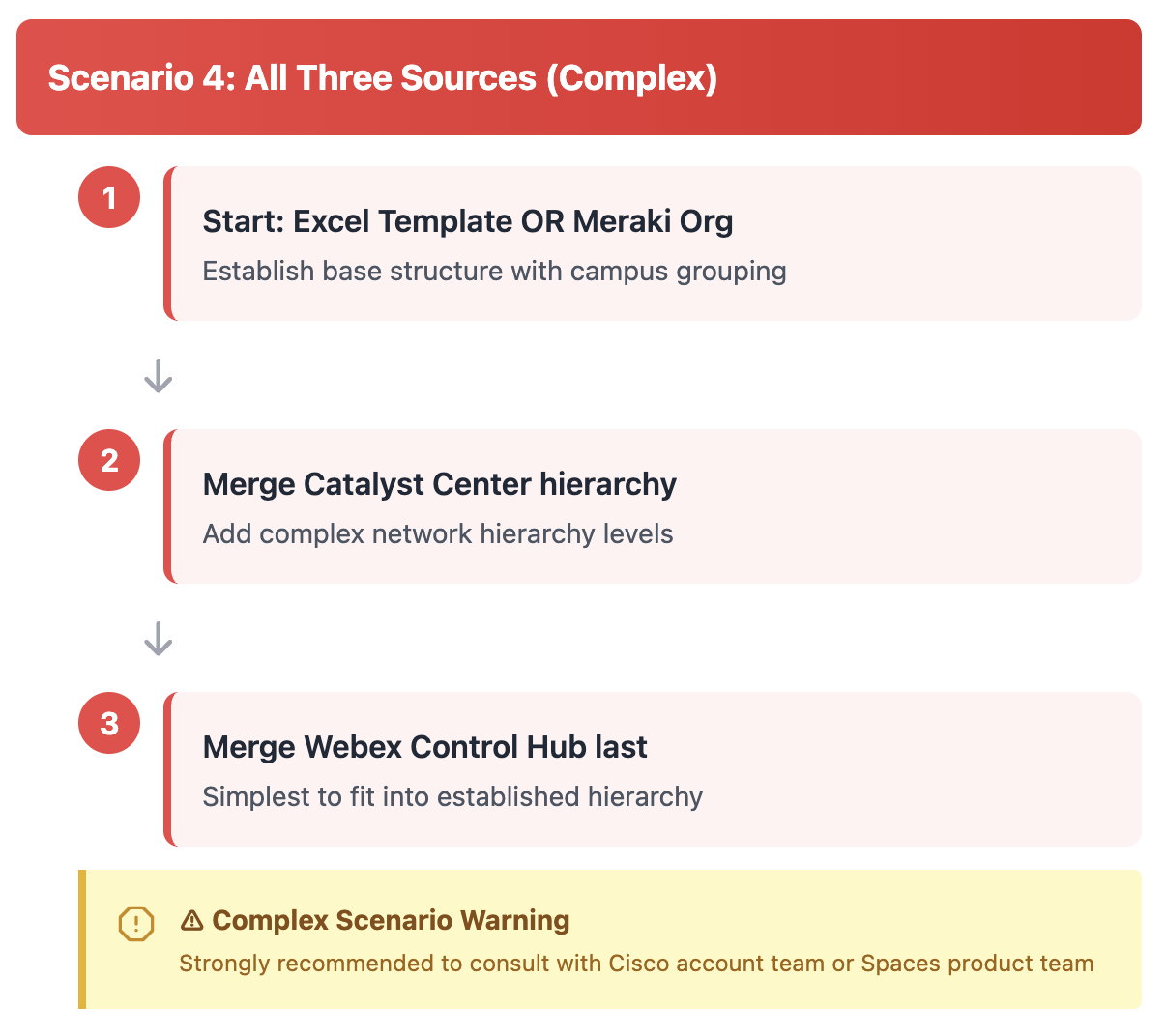 Three sources (for example: Meraki Org for wireless network APs and/or Meraki Things - MT sensors, Catalyst Center for network switches, and Webex Control Hub Org for collaboration devices) is one of the more complex Location Hierarchy merge scenarios. Please proceed with caution and it is highly encouraged to consult your Cisco account team and Cisco Spaces product management for guidance.