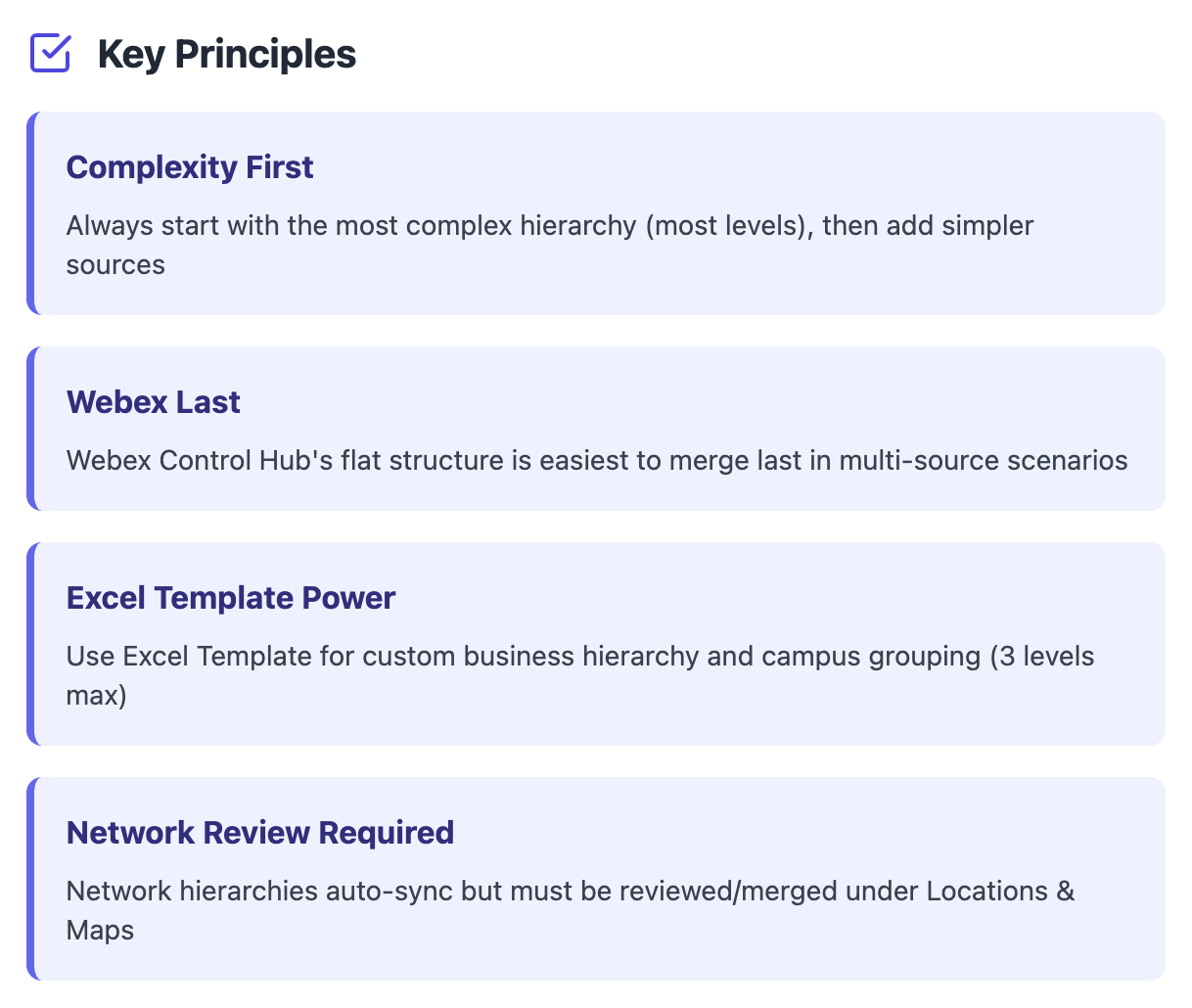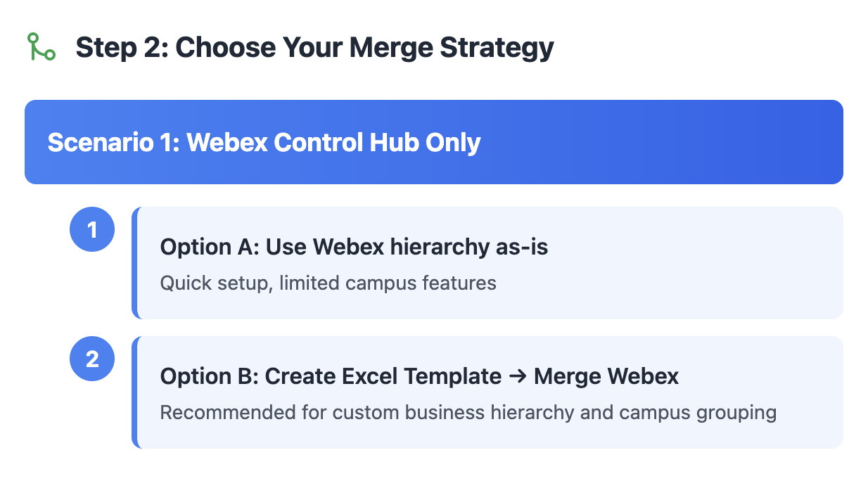 Because Webex Control Hub Locations are “flat”, they are also the easiest to merge into either of the more complex (i.e. more levels) network hierarchies and/or the Excel Template hierarchy method.